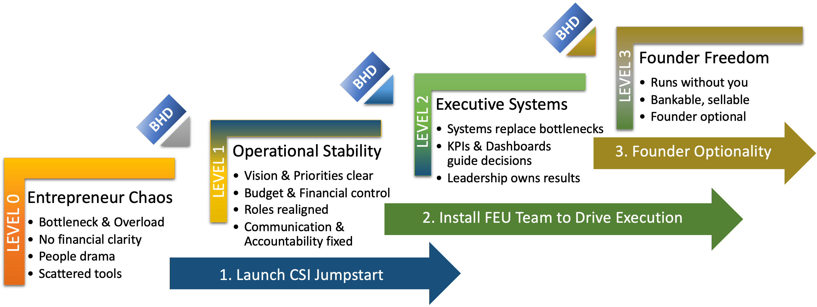 At Business Freedom Advisors™, we help overloaded founder-CEOs shift out of survival mode and into a business that works without them being the bottleneck.